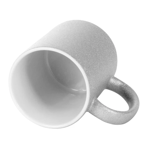 Tazón cerámico de 350cc. con superficie exterior glitter plateado, para Sublimación. Incluye caja blanca de Cartón color plata.