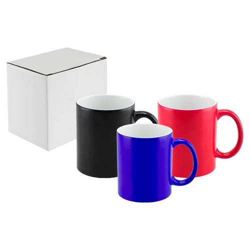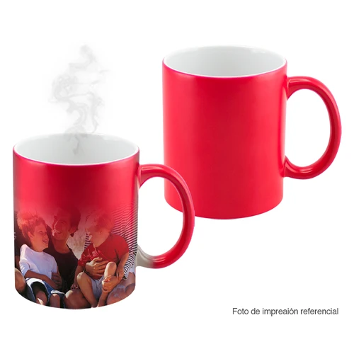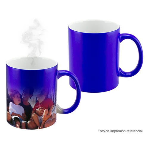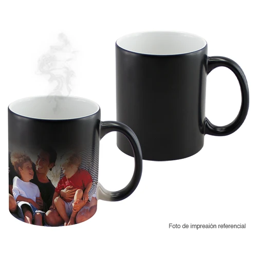 Tazón cerámico mágico color Mate (opaco) para Sublimación. Contiene polímero termo-reactor en la pared exterior del tazón. A primera vista parece un tazón negro estándar, pero en contacto con líquido caliente, la imagen sublimada comienza a aparecer nítidamente en el tazón. Una vez que el líquido se enfría, la imagen se desvanece y vuelve a aparecer el negro mate. Incluye caja blanca de Cartón.
