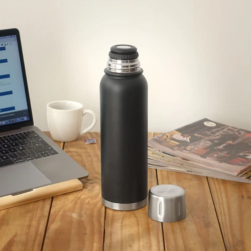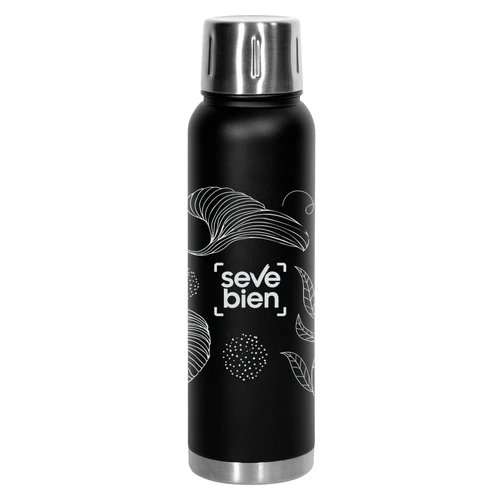 Ø 8,4 x 30 cm. Capacidad 1000 ml. Acero inoxidable. Termo Doble pared con recubrimiento de cobre. Interior en acero 304 y exterior en acero 201. Pintura Powder Coat (pintura mas duradera y resistente a la corrosión y el paso del tiempo). Tapa de acero a rosca. Tapón con apertura y cierre a presión. Mantiene por más de 12 hs la temperatura de las bebidas calientes y hasta 24 hs la de las bebidas frías. Presentación en caja de regalo.