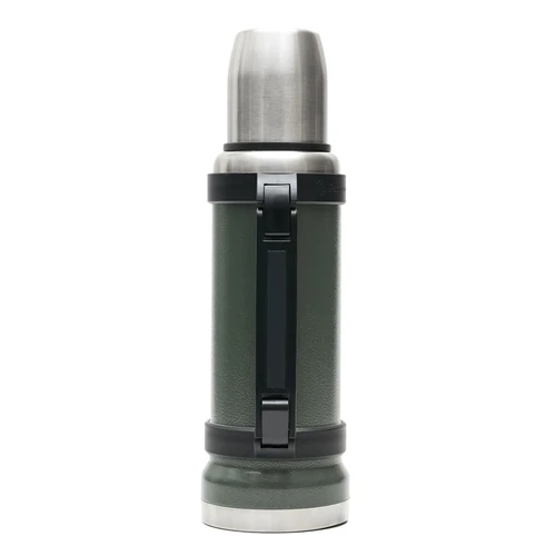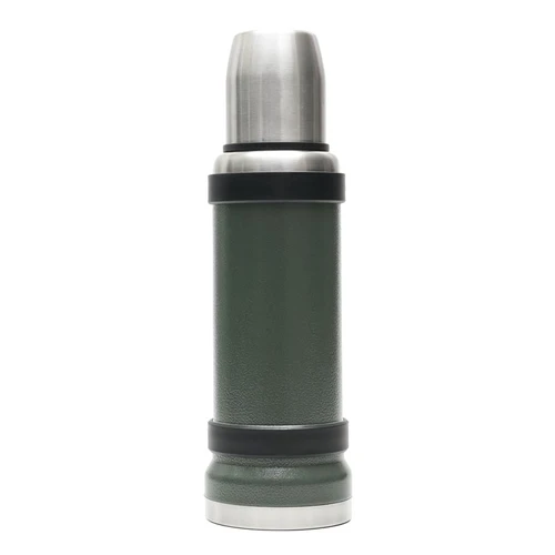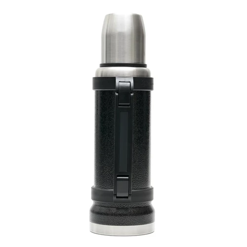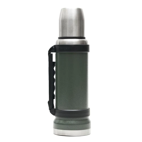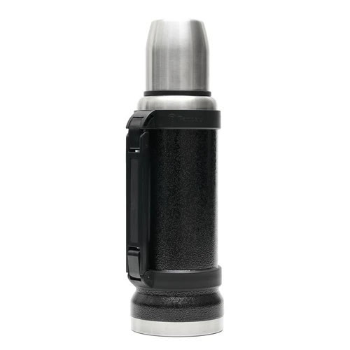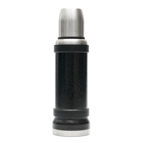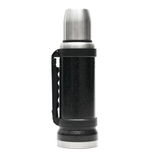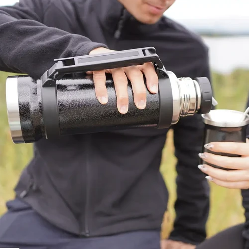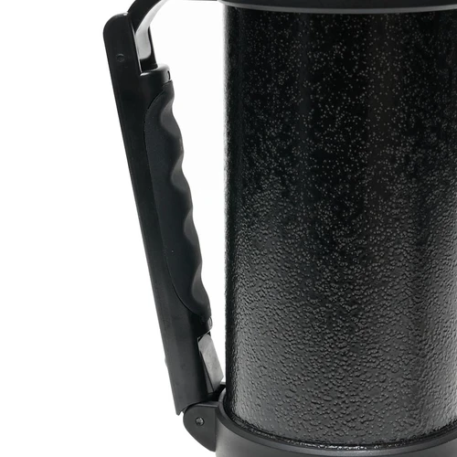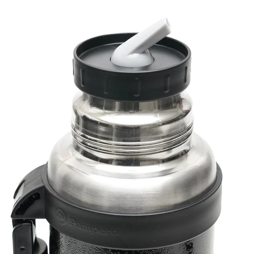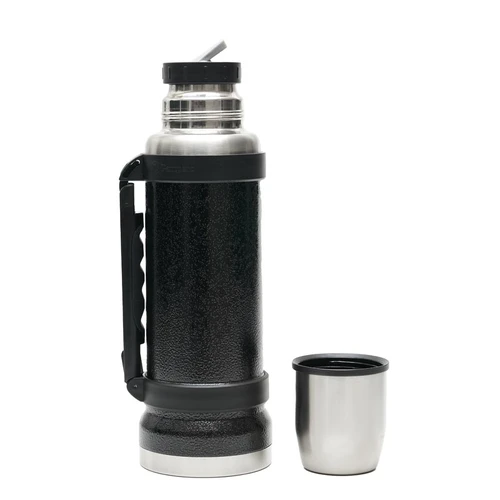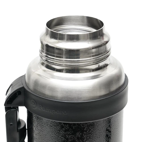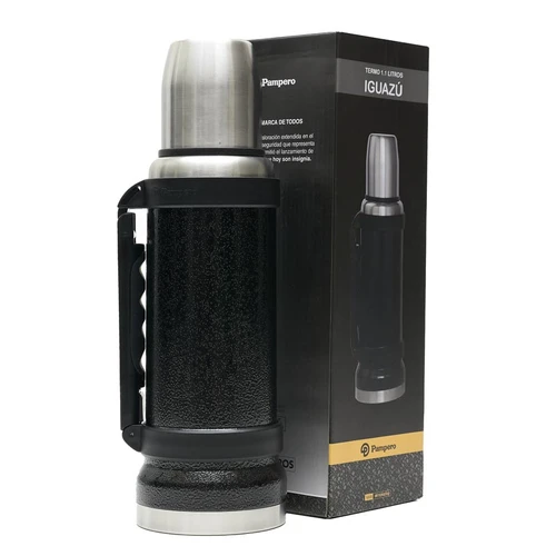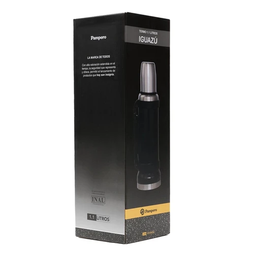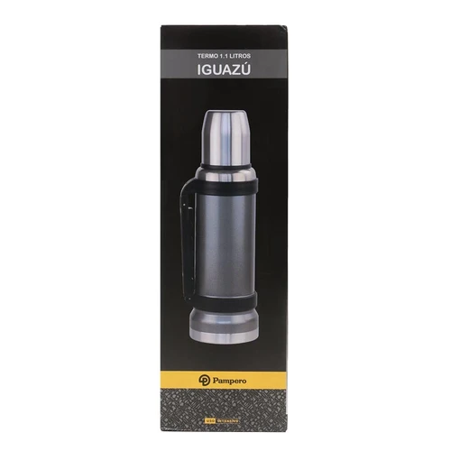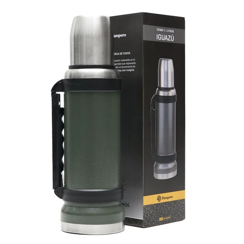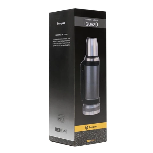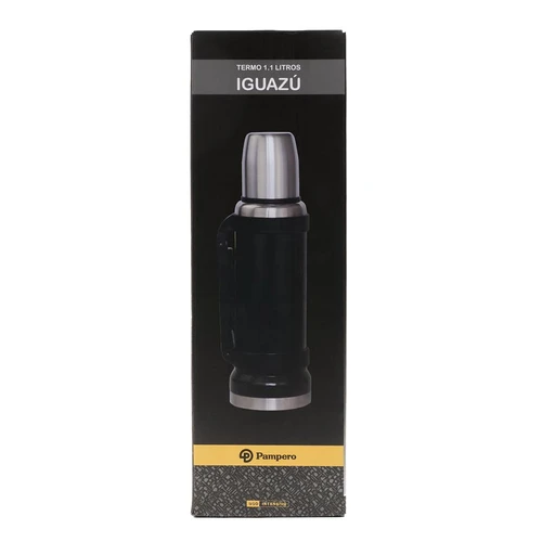 Termo de acero inoxidable 304, recubierto con esmalte especial que protege de ralladuras y golpes. Puede mantener el contenido a la misma temperatura durante 18hs, gracias a su doble pared aislante especial de acero. Cuenta con un tapón cebador Hermético a rosca con la función anti derrame y tapa con superficie plana estable para usar como taza o vaso y manija plegable para facilitar el transporte. Presentado en caja de cartón. Medidas del termo: 34 cm x 10,5 cm. Medidas de la caja: 35 x 11 x 11 cm. Capacidad: 1,1 Lts.