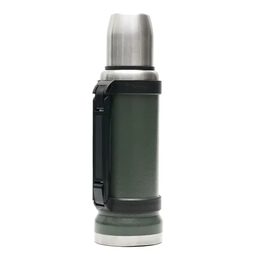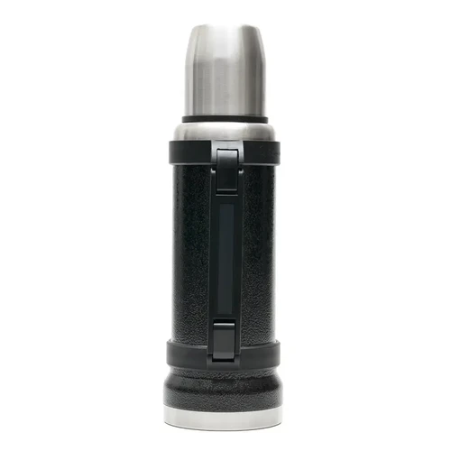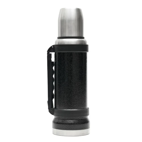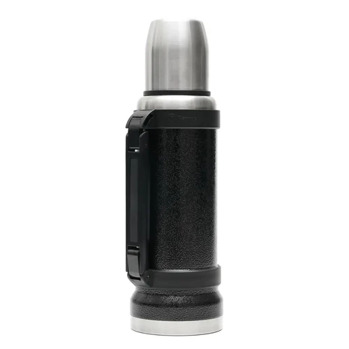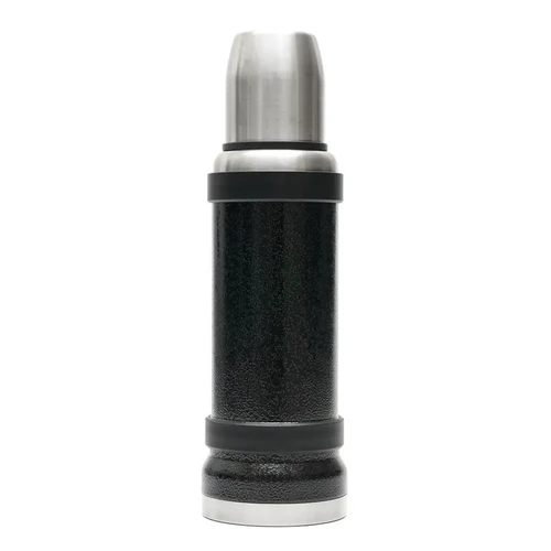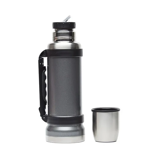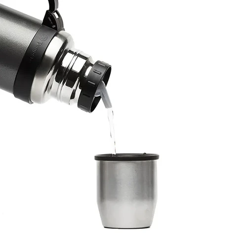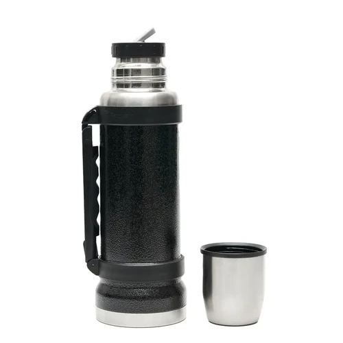 Termo de acero inoxidable 304, recubierto con esmalte especial que protege de ralladuras y golpes. Puede mantener el contenido a la misma temperatura durante 18hs, gracias a su doble pared aislante especial de acero. Cuenta con un tapón cebador Hermético a rosca con la función anti derrame y tapa con superficie plana estable para usar como taza o vaso y manija plegable para facilitar el transporte. Presentado en caja de cartón.