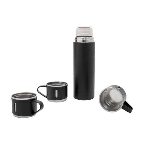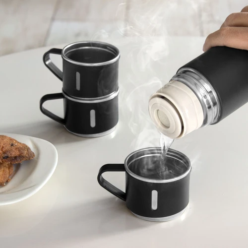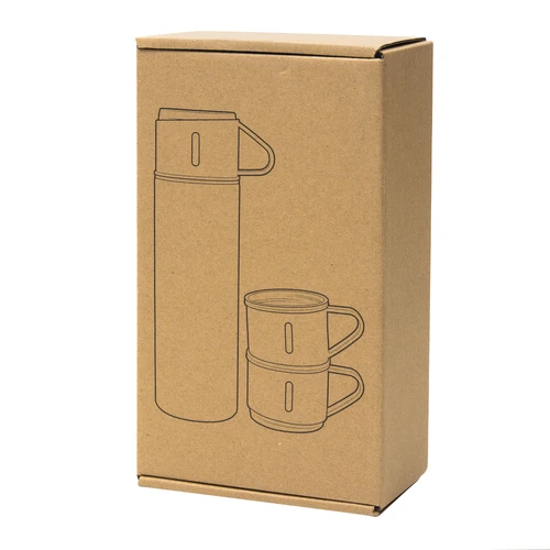 Ø 6,5 cm x 23,5 cm. Acero inoxidable y Polipropileno. Capacidad 500 ml. Set de termo y tres tazas. Termo con doble pared sellado al vacío. Acero inoxidable 304 interior / 201 exterior. Tapa y tazas Ø 6,5 cm x 5 cm. Capacidad 120 ml. Acero inoxidable 304 interior / Polipropileno exterior. Pintura acabado mate. Mantiene por más de 12 hs la temperatura de las bebidas calientes y 24 hs de las bebidas frías. Presentación en caja de regalo Kraft.