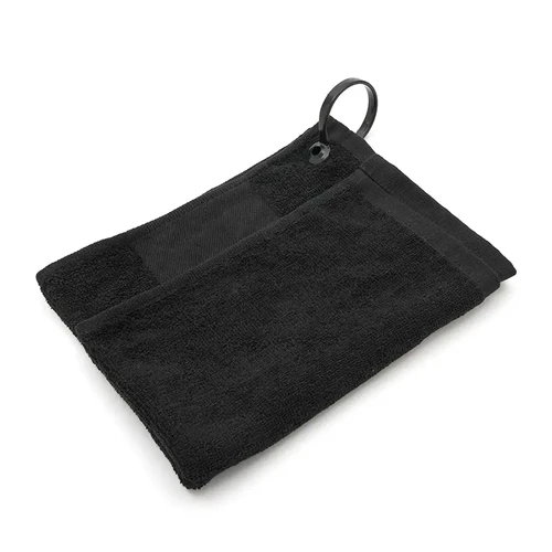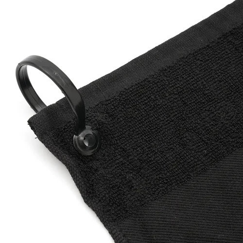 Toalla de golf con ojal metálico hecha de algodón de 400 gsm. Fabricada en algodón negro de alta absorción y suavidad, cuenta con un ojal con argolla metálica para colgar fácilmente en la bolsa de golf o cinturón. Es ideal para jugadores de golf que buscan mantener sus manos, palos o pelotas limpias y secas durante el juego.