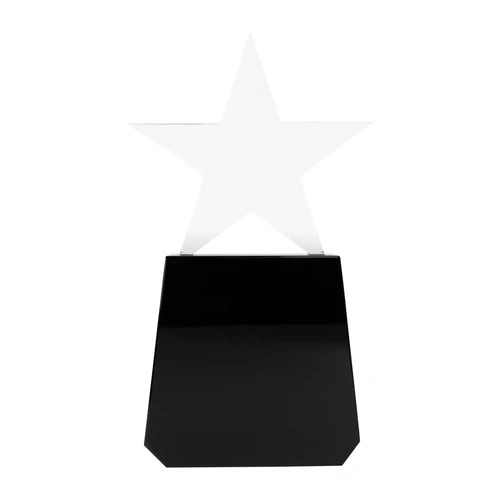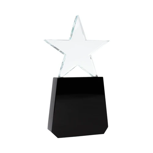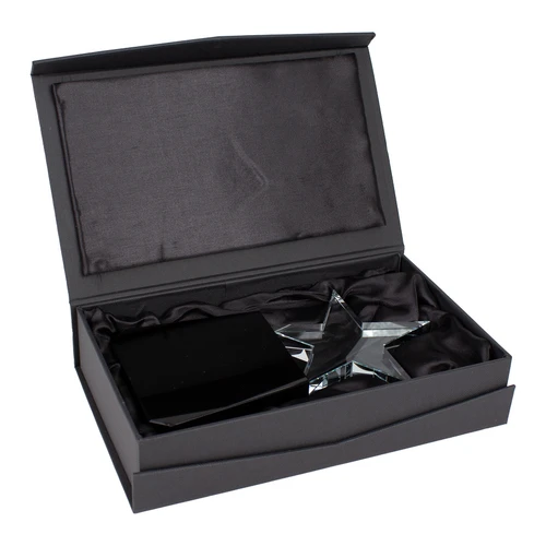 Elegante Trofeo modelo "Biondi", base de cristal negro y estrella de cristal en su parte superior. Presentación en caja de cartón forrado negro con cierre imantado, interior acolchado de espuma y tela poliéster satinado negro, con troquel.