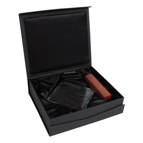 Elegante Trofeo modelo "Fischer", base de madera barnizada y cuerpo de cristal. Presentación en caja de cartón forrado negro con cierre imantado, interior acolchado de espuma y tela poliéster satinado negro, con troquel.