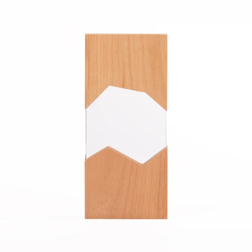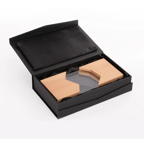 Elegante Trofeo Galvano modelo "Steven", en madera de pino barnizado, con incrustado de cristal en la zona central. Presentación en caja de cartón forrado negro con cierre imantado, interior acolchado de espuma y tela poliéster satinado negro, con troquel.