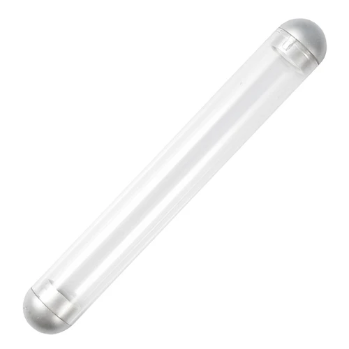 Tubo de Acrílico traslúcido para 1 bolígrafo. Tapas plateadas con superficie redondeada. No incluye Bolígrafo.