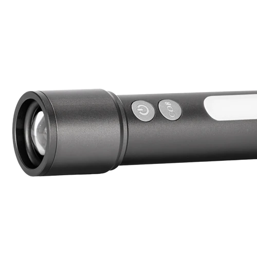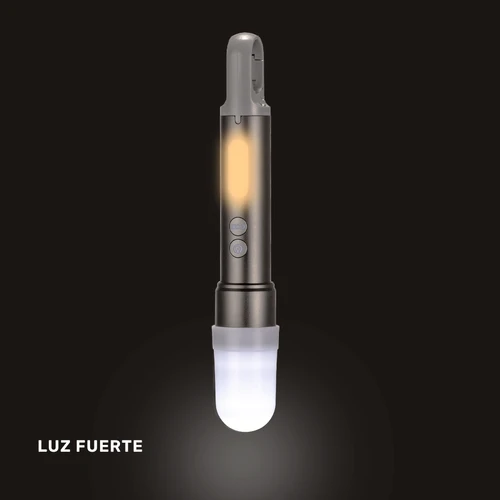 Linterna táctica recargable de Aluminio con 15 diferentes funciones. Luz LED principal con 5 funciones o intensidades: 100%-50%-25%-estroboscópico-SOS. Lámpara lateral con 4 funciones: 100%-50%-luz roja frecuente y estroboscópica. Control de apertura de foco. Incluye cápsula blanca para convertir la linterna en lámpara, incluye 3 filtros de color: azul-verde-rojo. Incluye Mosquetón para colgar. Incluye cable de carga USB-Tipo C y ranura Tipo C para cargar la batería interna. Características técnicas: 1) Batería de litio 18650 2) Voltaje: 3.7 V 3) Luminosidad: 1000 Lumen 4) Carga: 2000 mAh 5) Potencia: 20W 6) Alcance de Proyección: 150m 7) Tiempo de Carga: 5 horas aprox. Presentación en caja de regalo de cartón kraft.