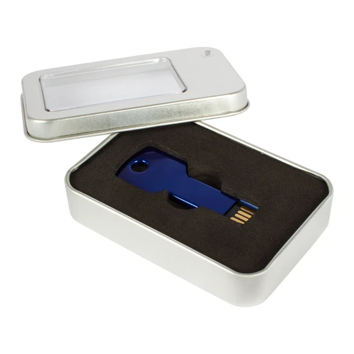 USB Pendrive 2.0 con 16GB de capacidad, con forma de llave metálica. Ideal para llevar en tu llavero personal. Presentación en caja metálica pequeña con ventana.