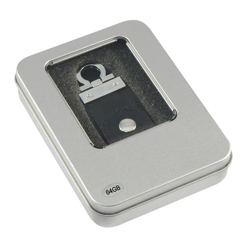 USB Pendrive 2.0 memoria de 64GB, de Eco-cuero. Presentación en elegante estuche de aluminio con ventana, dentro de cuna de esponja EVA negra.