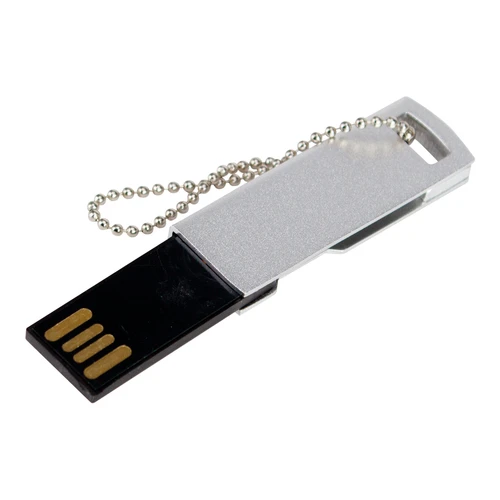 USB Pendrive 2.0 de 16GB de capacidad con carcasa giratoria y anillo colgante de acero inoxidable. Presentación en estuche de PVC translúcido empavonado, con cuna de EVA negra y cierre imantado.